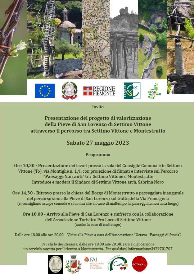 ore 10:30 - Presentazione dei lavori presso la sala del Consiglio Comunale in Settimo Vittone, con proiezione di filmati e interviste sul percorso "Paesaggi Narranti".